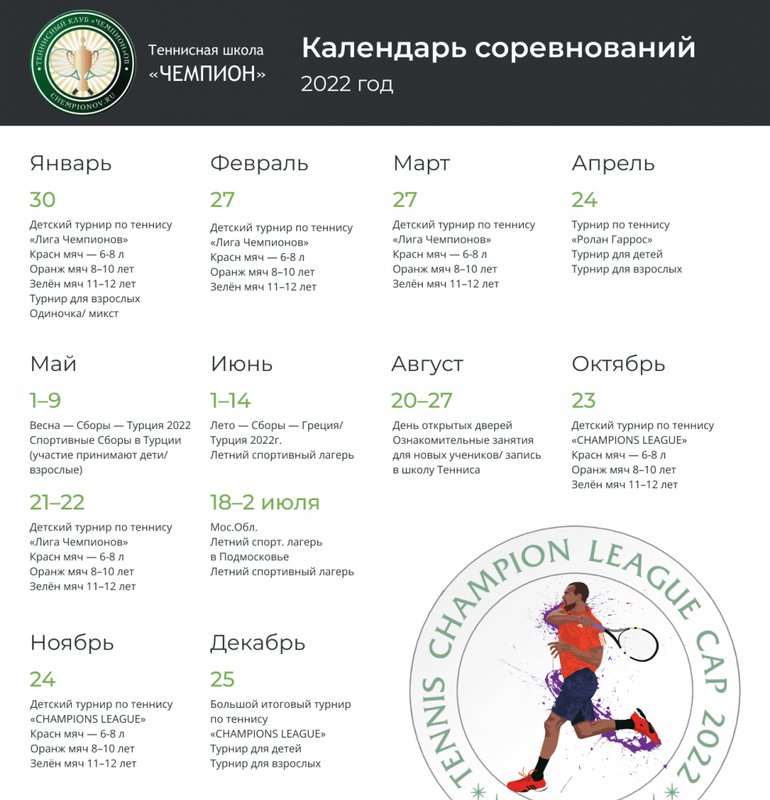 Каждый из нас учился в школе, многие закончили высшее учебное заведение. Однако в теннисно-спортивной школе Чемпион мы считаем, что развитие не должно заканчиваться никогда!